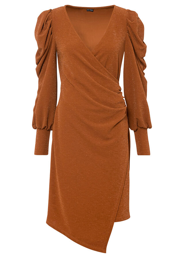 Kreacja uszyta jest z połyskującej, lureksowej dzianiny w kolorze rudego brązu.